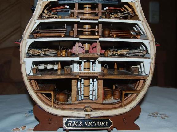 Dieser Querschnitt der berühmten HMS Victory erstreckt sich von Kiel und Laderaum über Orlopdeck und drei Batteriedecks bis hoch zum Quarterdeck. Schon die Spanten sind detailgetreu wiedergegeben. Diese Detailvielfalt zieht sich durch den gesamten Bausatz. Am Ende bietet sich ein faszinierender, detailgetreuer Einblick in das Innenleben dieses legendären Schiffes.