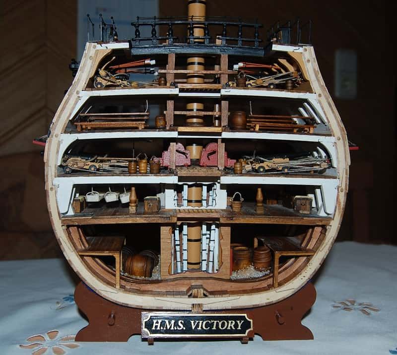 Dieser Querschnitt der berühmten HMS Victory erstreckt sich von Kiel und Laderaum über Orlopdeck und drei Batteriedecks bis hoch zum Quarterdeck. Schon die Spanten sind detailgetreu wiedergegeben. Diese Detailvielfalt zieht sich durch den gesamten Bausatz. Am Ende bietet sich ein faszinierender, detailgetreuer Einblick in das Innenleben dieses legendären Schiffes.